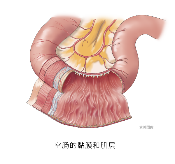 空肠具有四层结构,即黏膜层、黏膜下层、肌层及浆膜层;黏膜具有环状襞,黏膜内分布有孤立淋巴滤泡。